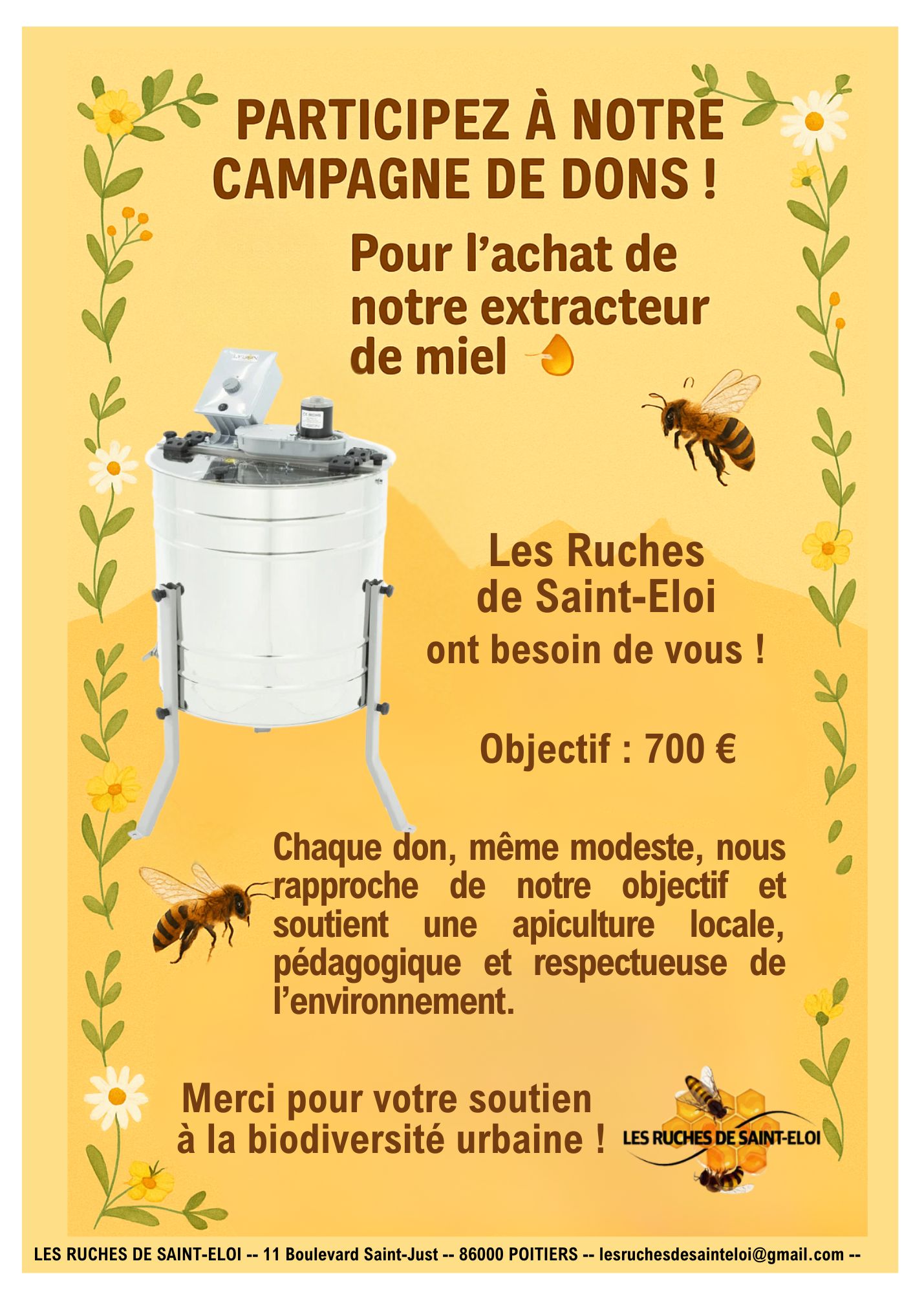Grâce à votre soutien, nous pourrons extraire notre miel en autonomie, Organiser des animations éducatives avec démonstrations et Valoriser le travail de nos abeilles auprès des habitants
